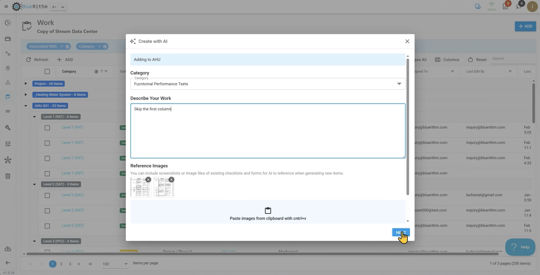 This makes it easy to give the system both written guidance and visual examples. For teams that already have legacy forms, handwritten checklists, or existing templates, those screenshots can help Bluerithm generate a more relevant starting point.