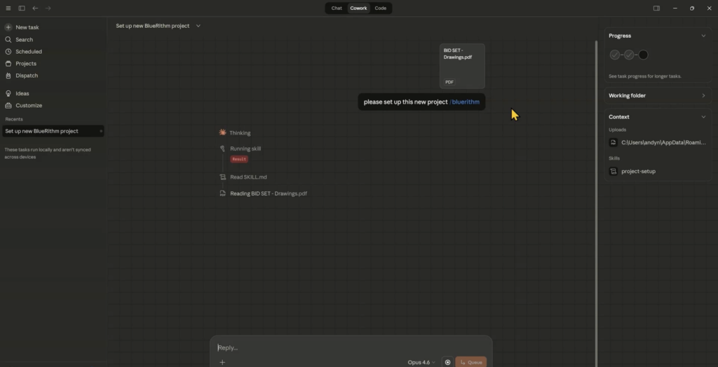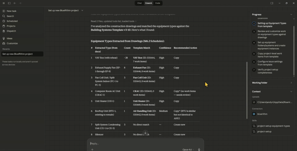 The Bluerithm + Claude Cowork integration enables users to start a project setup workflow with simple instructions and supporting project documents. From there, the AI can use Bluerithm’s plugin, backend services, workflow guidance, and reference materials to carry out a broad range of setup tasks.