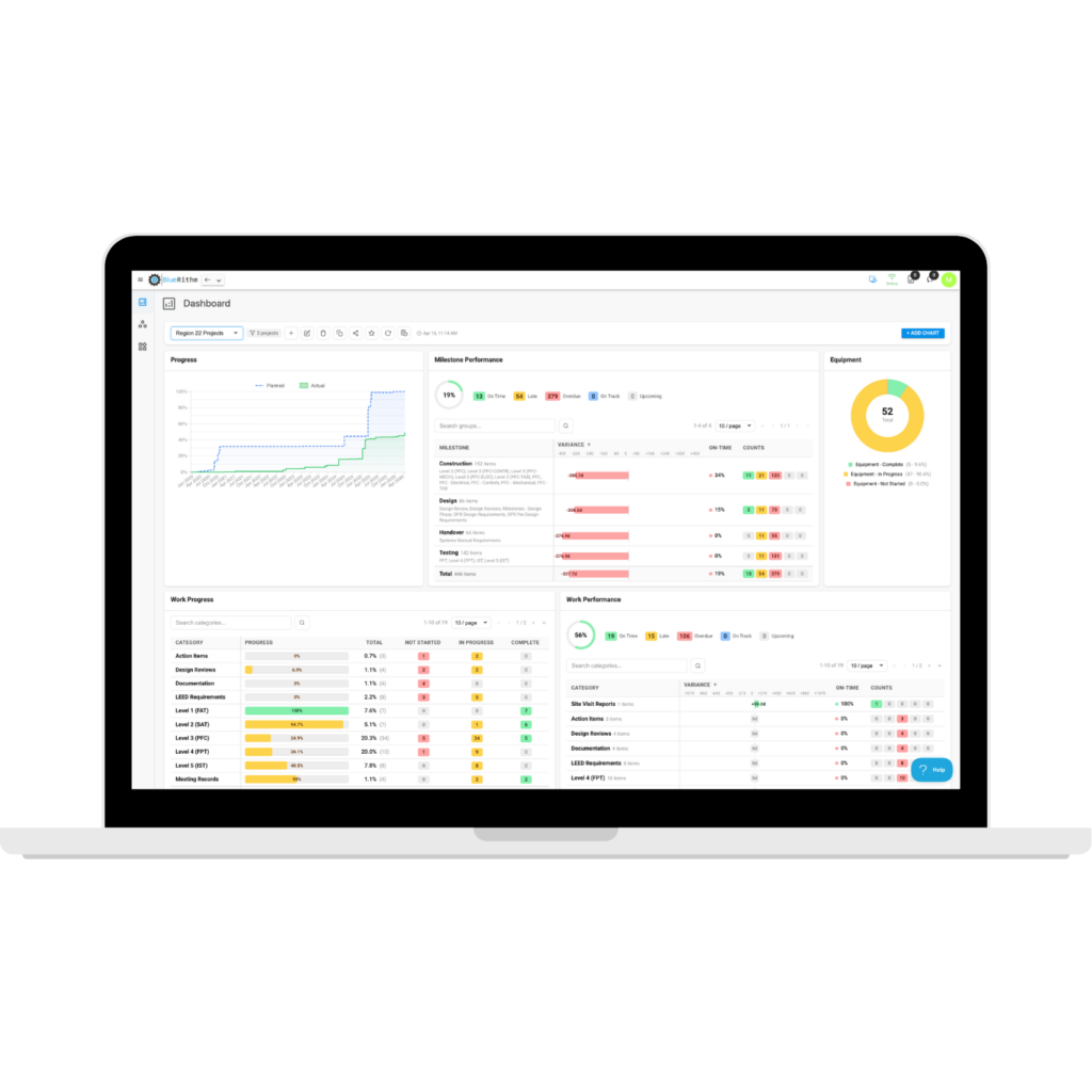 Bluerithm’s dashboards are not just about visualization—they are about better decision-making. With real-time project data organized into customizable views, teams can spot bottlenecks sooner, measure progress more clearly, and keep stakeholders aligned without building reports from scratch every time. The result is a more transparent commissioning process and a more efficient way to communicate what is happening across projects.
